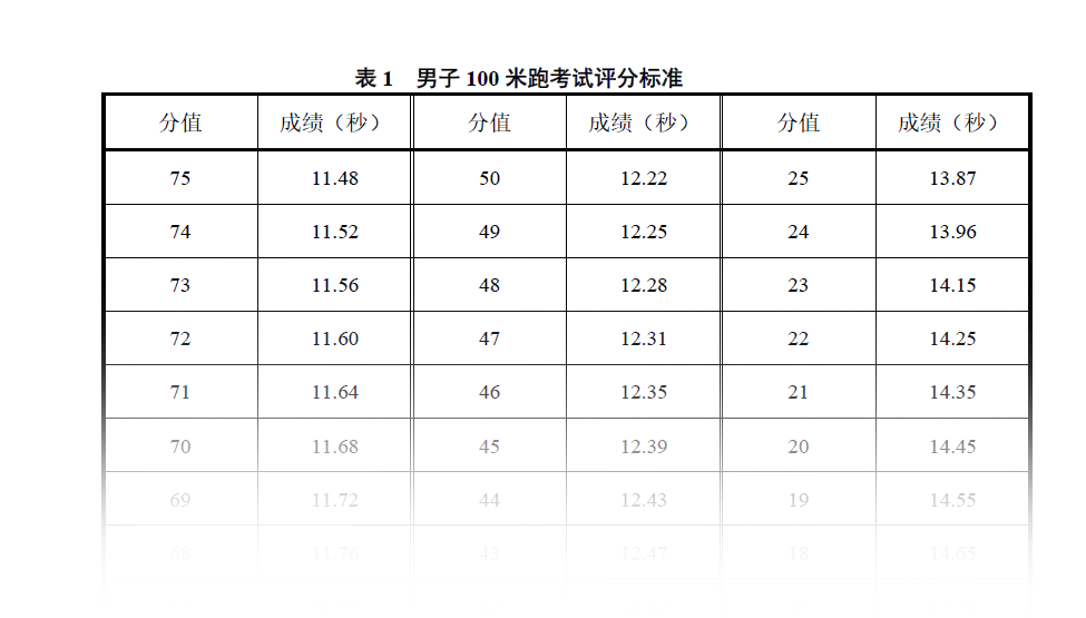 The following picture shows a typical assessment and normative times for students aiming to join sports universities in Guangdong Province, China.