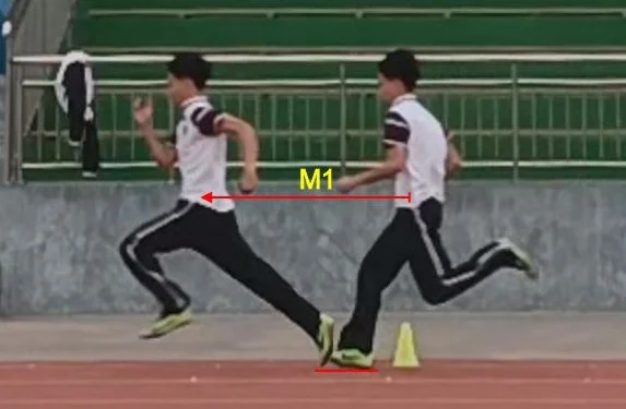 In the picture above, the kinogram illustrates the stance phase. It shows the runner striking the ground, moving forward, and shifting the center of mass, marked as M1.