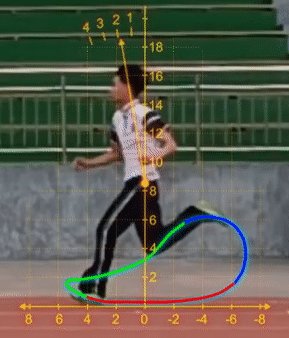 In a static frame, the trajectory appears as an open line: blue corresponds to the terminal swing, green corresponds to the initial swing, and red appears only as the point of ground contact, since the foot does not move through space while on the ground, as shown in the picture above.