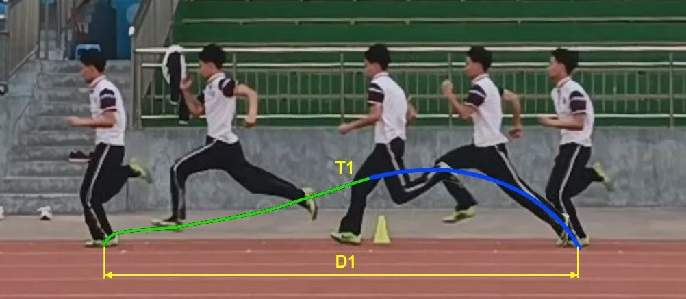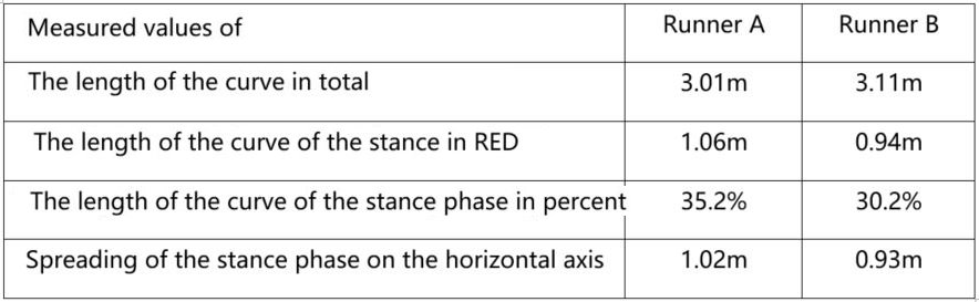 It can be observed that both runners create different shapes of trajectory, which are related to their running technique. In our case, we focus on the red part of the trajectory, which represents propulsion (the body’s forward movement). Here, we see that the red line of runner A is longer than that of runner B.