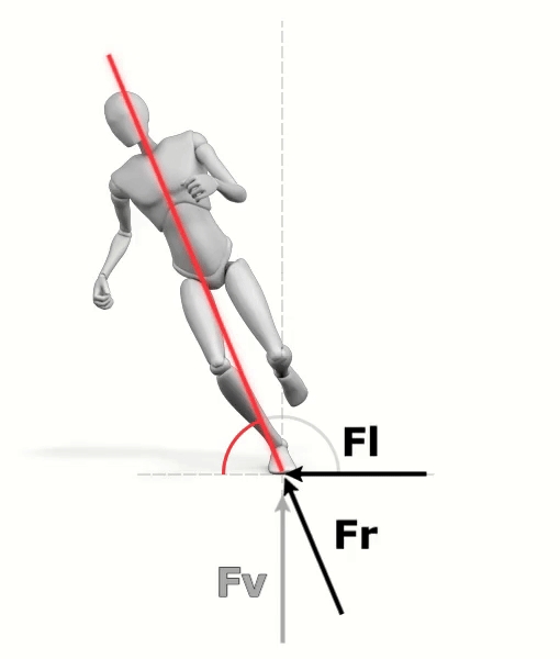 ✅ Fl (Lateral force): This force comes into play only when you lean your body to take a curve. When you run straight, your body stays vertical, so there’s no lateral force acting. But as soon as you lean, a lateral force develops at the planted foot, working in the opposite direction of the centrifugal effect. It pushes inward, helping prevent you from sliding outward. The more you lean, the stronger this lateral force becomes.
