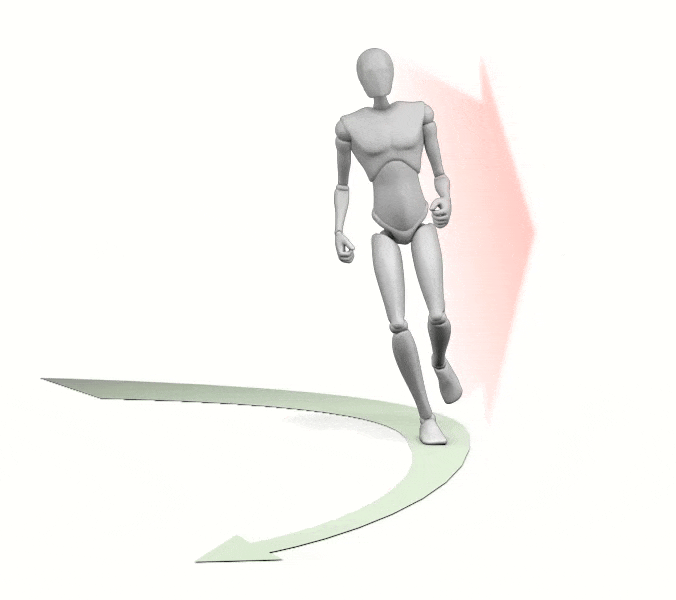 The faster you run and the sharper the curve, the stronger this outward pull becomes. As a result, the stronger the centrifugal force, the more your body must tilt inward, closer to the ground, to maintain balance. This inward lean helps counteract the outward momentum (represented by the red arrow in the illustration).