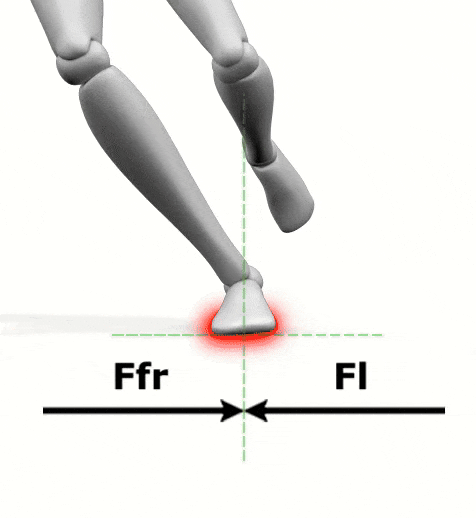 The animation above shows how your foot’s grip interacts with these forces on the ground. As the lateral force grows with a stronger lean, the friction force (Ffr) must also increase to counter it. These two forces act in opposite directions: the lateral force tries to slide your foot outward, while friction resists that movement, anchoring you firmly to the trail.